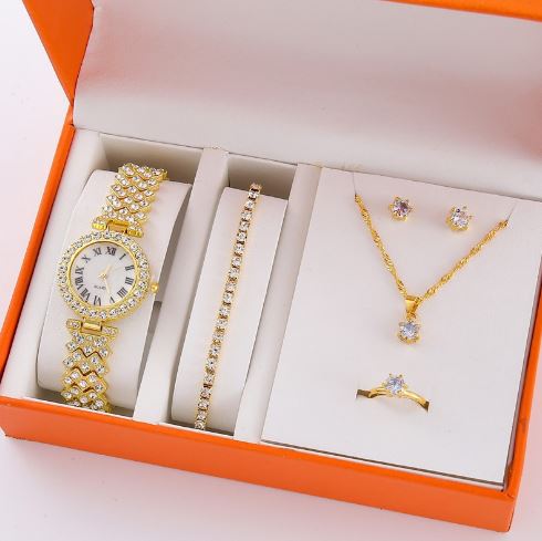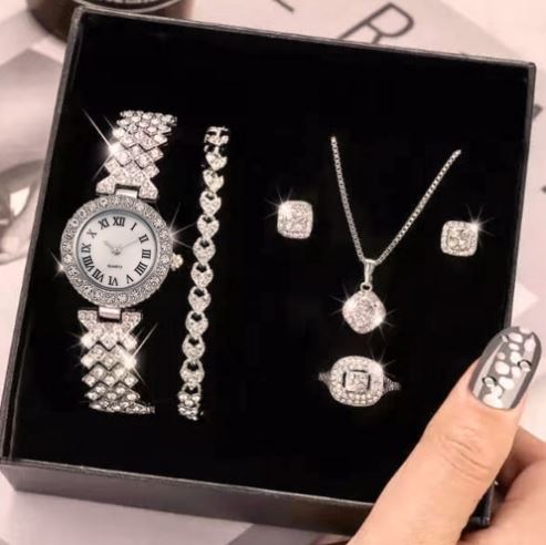 Notre ensemble est absolument exquis, avec une montre et des bijoux superbement conçus pour répondre à vos désirs de luxe. Il est doté d'un éclat inégalé qui capte le regard, vous mettant à part dans chaque pièce que vous entrez.