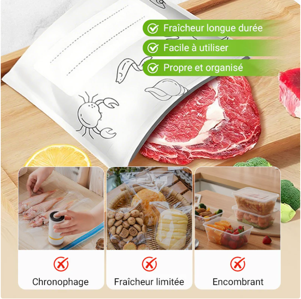 Nos sacs sont conçus avec un matériau de qualité alimentaire, sans BPA, pour une conservation saine et sûre. Ils sont réutilisables et faciles à nettoyer, ce qui en fait un choix écologique et économique. Fini les sacs jetables qui polluent notre planète.La fermeture hermétique assure une protection maximale contre l'humidité et l'air, préservant ainsi la saveur et la fraîcheur de vos aliments. Ils sont parfaits pour les fruits, légumes, viandes, fromages et bien plus encore.Profitez d'une conservation longue durée et réduisez le gaspillage alimentaire avec nos sacs pratiques et durables.